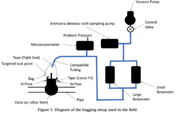 Once identified, fugitive emissions of ammonia were measured in the field by bagging. Bagging involves enclosing a leak site within a plastic bag and inducing a flow through the bag across the leak site, as shown in Figure 2. A schematic of bagging setup used for larger leak rates during the project is shown in Figure 3.