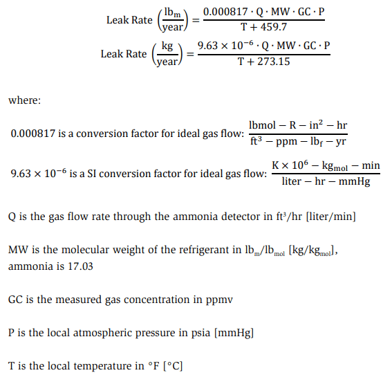 The following provides a method for calculating the leak rate for a bagged component wherein the microenvironment within the bag is being sampled with an ammonia detector using a known gas flow rate, measured concentration, local atmospheric pressure, and local temperature (EPA, 1995, pp. 4-9)