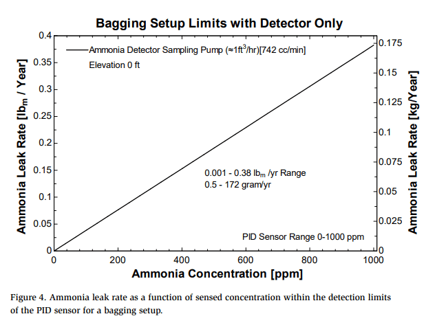 Bagging was found to be an effective way to measure a wide range of refrigerant release rates because the air flow through the bag can be controlled using a vacuum pump to maintain the mixture within the ammonia detector readable range. The ammonia detector used during this project is equipped with two (2) separate sensors: a photo ionization detector (PID) for sensing lower concentrations of ammonia (0-1,000 ppm) and a catalytic bead sensor for detecting higher concentrations of ammonia (4,500 -150,000 ppm). Figure 4 shows the effective leak rate measurement range as a function of ammonia concentration over the range of the PID sensor.