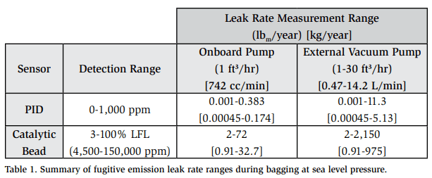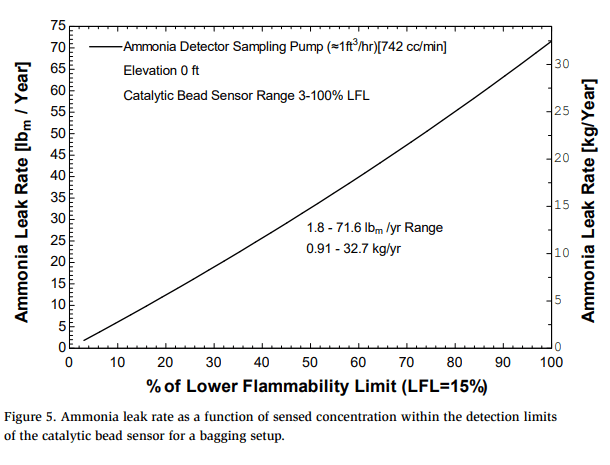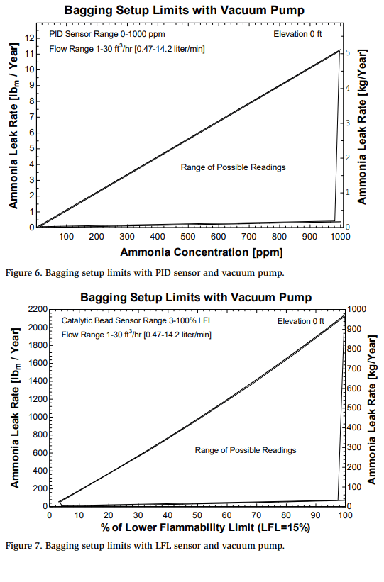 At the upper limit of detection for the PID sensor (1,000 ppm), the maximum leak rate corresponds to 0.38 lbm/yr [0.17 kg/yr]. Figure 5 shows the effective leak rate measurement range as a function of concentration for the catalytic bead sensor. In this case, the lower limit of detection for this sensor is 3% of the lower flammability limit (LFL, 4,500 ppm) and the corresponding lowest leak rate is 1.8 lbm/yr [0.82 kg/yr]. Because the handheld ammonia detector has its own fixed-speed sampling pump, decreasing the sampling pump’s flow rate is not an option, as the unit alarms and requires a pump restart when a decrease in gas flow rate is detected. Without the use of a separate vacuum pump to dilute the bagged concentration of ammonia by increasing airflow, there is a gap in leak rate measurement capability using the handheld detector alone.