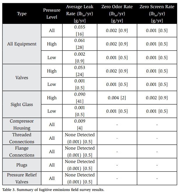 The primary purpose of conducting field work at the facilities was to find and quantify fugitive emissions of ammonia. A total of one-hundred seventy-five (175) different refrigeration system components were surveyed, including one-hundred fifty-nine (159) screened and one-hundred ten (110) bagged. Of the 175 components, a total of thirty-four (34) items had detectable refrigerant emissions, made up of twenty-one (21) sight glasses, twelve (12) system operating valves, and a compressor housing. Unexpectedly, the threaded connections, unions, flare fittings, flanges, check valves, plugs and pressure relief valves surveyed exhibited no fugitive emissions. Items with no detectable emissions were assumed to have a release rate below the lowest detectable level for this setup at 0.001 lbm/yr [0.5 gram/yr].