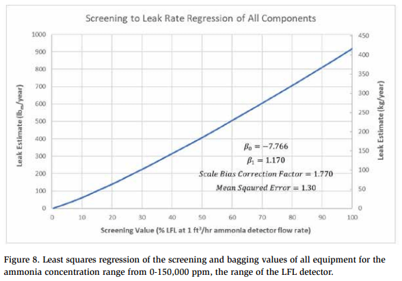 The regression for screening all equipment using an ammonia detector drawing ~1 ft3 /hr [472 cc/min] through the sampling pump is shown in Figure 8. It would be expected that refrigerant detectors with higher gas flow rates would yield lower screening values for the same leak point due to dilution, and higher screening values for lower flow rate detectors due to less dilution. The actual relationship would need to be investigated further if a screening/bagging relationship is needed for other ammonia detectors or sampling flow rates. Most screening was conducted by moving the refrigerant detector’s probe tip in the immediate vicinity of the leak site while avoiding obstructing the probe and moving at a rate to accommodate the detector response time. Retracting the detector probe tip any distance away from the leak site creates lower screening readings for a given leak rate due to dilution of the sample drawn. Many small releases are not estimated due to the time required to directly measure the release rate coupled with the urgency of stopping known releases. Utilizing a least squares regression provides a fast, easy way to estimate release rates prior to repair, allowing facilities to better understand losses from these releases.