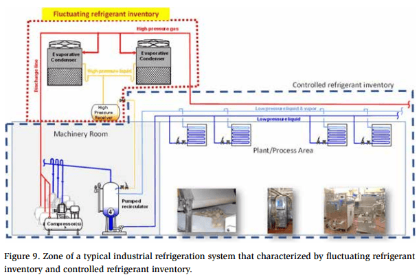 The first step in tracking the dynamic system inventory for a plant is to calculate the total amount of refrigerant contained within that system. This is usually referred to as the “maximum intended inventory” or “refrigeration system charge.” Calculating the inventory requires accounting for all refrigerant contained within all vessels, piping, evaporators, condensers, and any other components that make up the refrigeration system. More guidance on conducting a refrigerant inventory calculation is provided in a separate document, IRC (2020b).