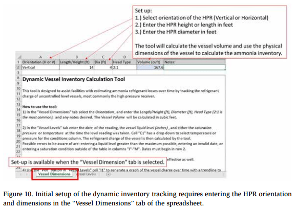 A dynamic inventory tracking tool was created to facilitate the process of trending refrigerant losses occurring with an ammonia refrigeration system. The process begins with entering the orientation and dimensions of the system’s HPR as shown in Figure 10. Upon completing the initial setup, the user would click on the “Vessel Levels” tab to enter collected data. Figure 11 shows the “Vessel Levels” tab with an example of the data entry for the tool that includes date, liquid level, and the system condensing pressure for each log condition entry. For each entry, the tool automatically calculates the information shaded in blue, including liquid and vapor density for ammonia, liquid and vapor volume, and total quantity or charge of ammonia in the HPR based on vessel dimensions and properties of ammonia.