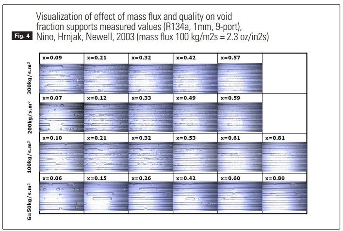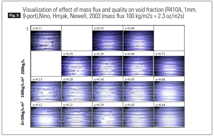 It is very important to have in mind that the void fraction is a function of mass flux (this fact even some void fraction correlations neglect). This relationship is a very important tool when designing to reduce refrigerant charge. The trend is the same as discussed above: reduction in diameter increases mass flux and increases void fraction, consequently reducing charge. This trend was shown in the graph shown in Figure 1.