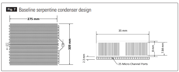 The heat transfer on both sides (not only on refrigerant that is mostly affected when varying design options for charge reduction) is important and affects the result. That is the reason why maintaining identical air side is important. To maintain identical outside (air-side) conditions for each refrigerant, the heat exchanger type selected is the microchannel serpentine (two circuits) shown in the Figure 7 and with dimensions given in Table 1. Selection of microchannel type is due to its relevance today and for its anticipated acceptance by more manufacturers. In addition, high heat transfer coefficients and fin enhancement place this type of heat exchanger between conventional round tube plate fin types and water cooled or cooling types, providing a more universal basis for conclusion. A serpentine design was selected to avoid uncertainties in predicting the charge in headers for various refrigerants. The serpentine design does not reduce the generality of the conclusions or even limit the increase in mass flux. Figure 7: Baseline serpentine condenser design