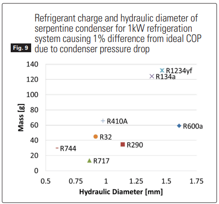 As said above, the most logical starting point for reducing charge in heat exchangers begins with the reduction of internal volume. A result of reducing the pipe diameter is increased pressure drop. The fair comparison of refrigerants should be based not on equal pressure drop itself but on the effect pressure drop has on efficiency (COP) while maintaining the same capacity.