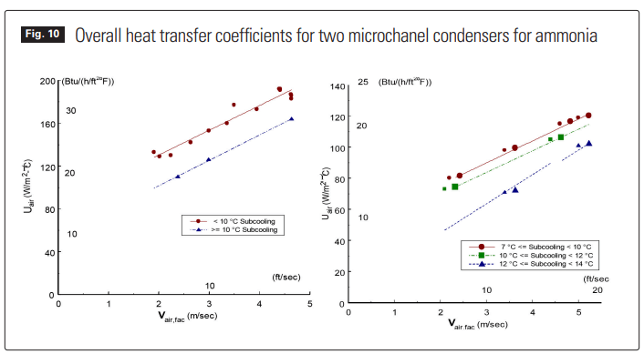 Overall heat transfer performance and charge measurements were taken for each condenser and the system as a whole. The microchannel heat exchanger with parallel flow performed better in every respect. Overall, condenser performance was quantified in terms of U values for different air flow rates, superheating and subcooling conditions and is presented in Figure 10. Refrigerant inventory measurements of the condenser were taken at different operating conditions.