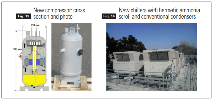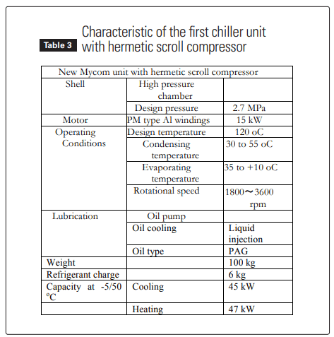Probably the most important recent development is the new Mycom hermetic compressor that is used for both refrigeration and heat pumping. The wrap is specifically designed for use with ammonia. Nominal capacity in cooling (at -5oC/50oC) is 45 kW while in heat pumping is 47 kW. Motor is IPM type with aluminum windings. There are two models: for low and high temperature. The weight of the hermetic version is about 100 kg. This compressor is equipped with an oil pump. The ammonia charge of the unit is 6 kg (see Table 3 and Figures 13 and 14).
