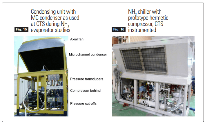 Development of microchannel condensers for ammonia has moved from the Air Conditioning and Refrigeration Center at the University of Illinois to Creative Thermal Solutions (CTS), a high tech company that specializes in research and development of novel refrigeration and air conditioning approaches. Figure 15 presents a photo of a condensing unit with microchannel heat exchanger used in an experimental facility for evaluation of ammonia evaporators, while Figure 16 shows a unit from Figure 9, CTS instrumented for implementation of MC condensers. The MC condensers used improved performance with 87% face area of original round tube condenser, with only 19% of core volume and just 7% or original weight and 27% or original refrigerant volume – charge. Just few weeks ago M. Tomooka of Mycom presented these results in the paper at IIAR meeting in Orlando, FL “Application of Microchannel heat exchangers to compact ammonia systems”