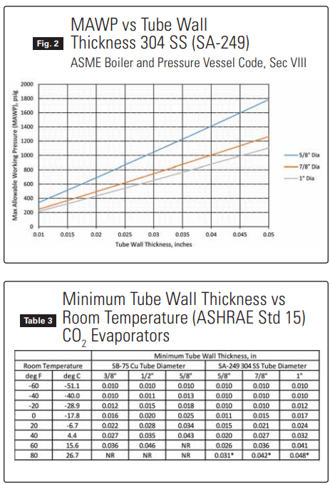 Table 3 shows the tube wall thickness needed to meet the requirements of ASHRAE Standard 15 in a CO2 evaporator operating at various room temperatures.
