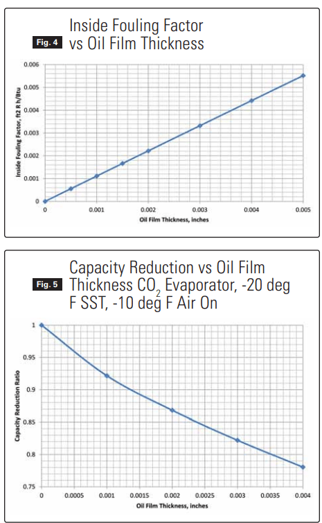 Figure 5 translates this fouling factor into an expected reduction in cooling capacity for a CO2 evaporator operated with increasing oil film thickness. For example, a CO2 evaporator design to operate oil-free will have its cooling capacity reduced by a factor of 0.87 (a 13% reduction) when the internal tube surfaces are coated with an oil film 0.002” thick.