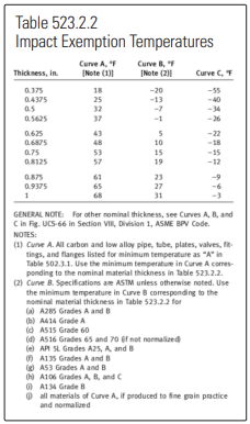 However, all is not lost. There are other solutions to the brittle fracture problem, all spelled out in paragraph 523.2.2. For example, carbon steel that is thinner than 0.10 inches is exempted down to -55°F. There are pipe specifications that include impact testing, such as A333, Grades 1 and 6 certified down to -50°F and some other grades are certified down to -150°F. Some aluminum and stainless-steel specs are totally resistant to low temperature embrittlement… good to -425°F.