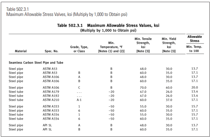 We find ourselves, 70 years later using much the same carbon steel for our pressure vessels and pressure piping at lower and lower system design temperatures. The two controlling codes, ASME Section VIII for vessels and ASME B31.5 for piping, have recognized the problem and have methods for dealing with the loss of ductility at low temperatures. Both codes are under the control of the ASME and use common allowable stress tables for carbon steel plate and pipe and, mostly, common stress calculation methods. See Table 502.3.1.