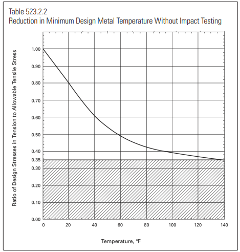 Figure 523.2.2 shows both methods. The left side asks you to divide your calculated design stress by the room temperature allowable stress for your material (from Table 502.3.1). If you enter the chart at 0.35 or below (in the shaded area) you are good for just about any low temperature. The scale across the bottom of the chart tells you how many degrees you can go below your material specified minimum temperature from 502.3.1. If you enter the chart above the 0.35 number, you traverse over to the curve. Then if you go down from there it tells you the temperature reduction from the minimum that you are allowed for your selected material.