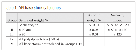 The American Petroleum Institute (API) produces a chart that classifies the different base oil types, see Table 1.