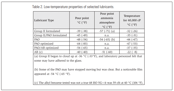 Table 2 compares the pour point, pour point under liquid ammonia, and the temperature at which each lubricant type reaches a nominal viscosity of 40,000 cP for several 68 ISO VG lubricants.