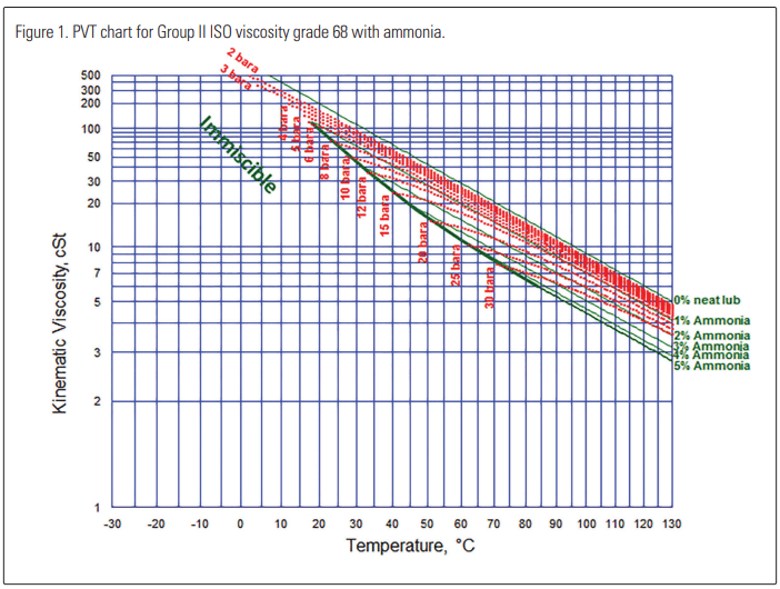 Pressure viscosity temperature (PVT) tests with ammonia have previously been reported for alkyl benzene ISO VG 68 (Seeton 2014). The report indicates that at 70°C (158 °F) and 30 bar (435 psi) ammonia is 6% mass soluble and would have a viscosity of about 3.7 cSt. An example for operation in a screw compressor might be at a lower pressure. The values used are not to suggest these pressures and temperatures are common or standard; rather they were selected to provide values easier to demonstrate results using the figures provided. At 15 bar (217 psi) and 67°C (153 °F) the solubility was much lower at 2%, resulting in a viscosity of about 8 cSt. The 2% dilution when cooled to about 42 °C (208 °F) reached 20 cSt, which would be suitable for lubricant supply to a screw compressor.