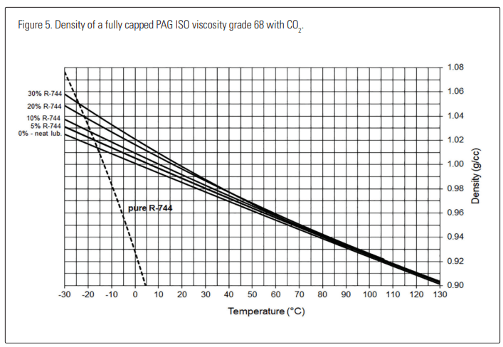 As Figure 4 shows carbon dioxide changes density very rapidly with temperature. PVE is not seen on this chart; however, it is expected to be similar to PAG. Similar charts have been published since 2000 (Hagita 2000 et al), This can result in a poorly miscible lubricant floating on top of the liquid refrigerant at some temperatures, while sinking to the bottom at other temperatures. This property is known as “phase inversion” and can be problematic in terms of oil separation. The density of the immiscible phase for the partly miscible lubricants will increase with increasing solubility of the CO2 . See Figure 5.