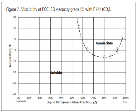 Table 4 presents a general consensus of the miscibility of several lubricants as reported in literature. Of these, only POE, polycarbonate, and PVE types have been described as miscible. In general terms, this miscibility is not complete through all temperatures, as even the miscible lubricants have ranges of immiscibility in areas of low concentration in the CO2 at higher temperatures.