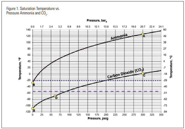 When the pressure is reduced in such a vessel, some of the liquid flashes to vapor, auto-refrigerating the remaining liquid. As the pressure drops, the pool temperature follows the saturation curve for that refrigerant. If the refrigerant is ammonia at a pressure of 300 PSIG (20.7 barg), the starting temperature is 126.5°F (52.5°C), with a lower temperature of -28°F (-33.3°C) as the refrigerant reaches atmospheric pressure. This process is depicted as moving from point A to B in Figure 1. If the refrigerant is CO2 at a pressure 300 PSIG (20.7 barg), the starting temperature is 1.7°F (-16.8°C). As the pressure of the CO2 drops, some of it evaporates, leaving cooler liquid behind, but only until the pressure reaches 60.4 PSIG (4.2 barg) at -69.9°F (-56.6°C). This process is depicted as moving from point C to D in Figure 1. At point D, the “triple point” temperature, vapor, liquid, and solid CO2 can coexist. But if the pressure is dropped even lower, all the liquid converts to a mixture of dry ice (solidified CO2 ) and vapor at a temperature below -69.9°F (-56.6°C). As the pressure of the dry ice/ vapor mixture is dropped from the triple point down to atmospheric pressure, temperature of the solid dry ice and the vapor in contact with it reaches -109.3°F (-78.5°C), depicted as moving from point D to E in Figure 1.