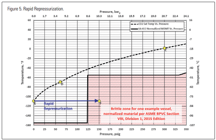 Given enough time, the warm gas would equilibrate with the cold dry ice and/or cold CO2 liquid in the vessel, but initially, near-equilibrium conditions only exist near the surface of where the gas is contacting the liquid pool or residual dry ice. If the repressurization has raised the pressure in the head space to 150 psig (10.3 barg), but there is residual dry ice in the bottom of the vessel, instrument lines, etc., that dry ice may still be at -109°F (-78.3°C), as illustrated by point “F” in Figure 5. From this figure, it can be seen that point F is in the “brittle region,” so those portions of the vessel at that combination of pressure and temperature may be vulnerable to brittle fracture.