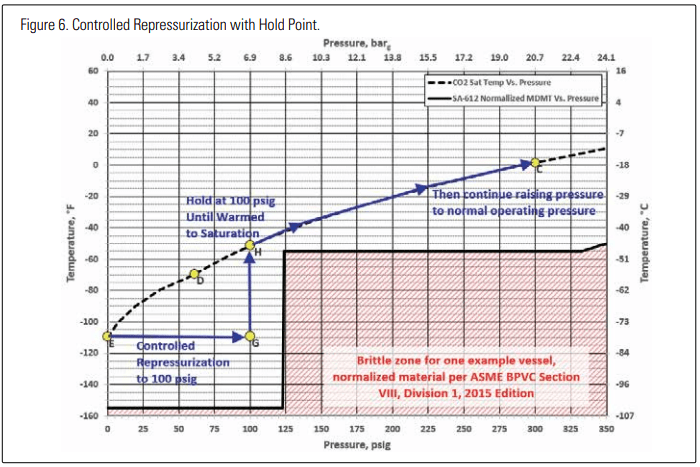 The problem regarding repressurization of CO2 vessels that have lost pressure is that when the repressurization process is started, the vessel and its contents may be at a temperature below the lowest listed MDMT, and care must be exercised to avoid adding heat and raising pressure in the vapor space faster than the heat can be transferred to the cold dry ice at the bottom of the vessel. If the pressure rise occurs slowly and/or in controlled steps, the dry ice has time to absorb heat and reliquefy, equilibrating with the vapor space, and the metal walls can absorb heat and rise to a temperature where they are no longer in a brittle condition.