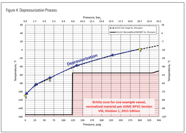 Now consider what happens if the contents of such a vessel are depressurized. Figure 4 illustrates the reduction in temperature as the vessel pressure drops. In this case, for this A516 vessel, the saturation temperature of the CO2 at a given pressure never drops below the vessel’s minimum allowable temperature for that pressure. There is little or no danger of brittle fracture as the vessel is depressurizing.