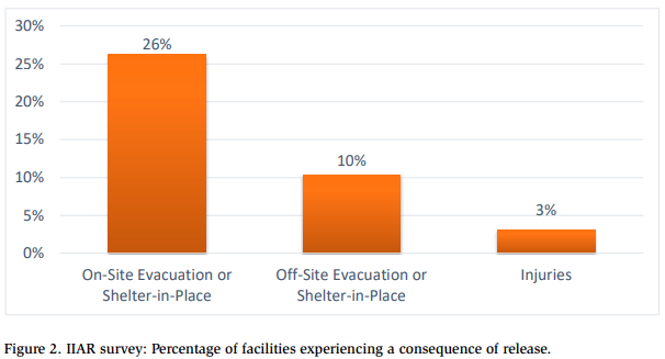 Figure 2 summarizes the consequences of the releases reported in the IIAR survey. Facilities were evacuated in approximately one-quarter of the releases, and off-site consequences occurred in 10% of the releases. Only 3% of the releases resulted in injuries.