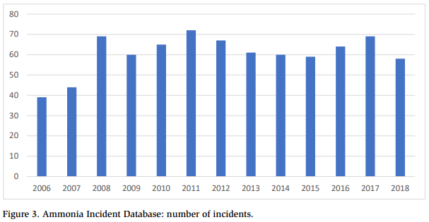 Figure 3 answers the question concerning the changes in incident numbers—a question that always arises when analyzing or developing safety procedures for the industrial ammonia refrigeration industry. Between 2008 and 2018, ammonia incidents per year reported in the Ammonia Incident Database was relatively constant, averaging 64 reported incidents in the United States and Canada per year. Thus, the number of incidents neither increased nor decreased—it remained essentially constant during that time period. 1. Have the Number of Incidents Increased or Decreased? Figure 3 answers the question concerning the changes in incident numbers—a question that always arises when analyzing or developing safety procedures for the industrial ammonia refrigeration industry. Between 2008 and 2018, ammonia incidents per year reported in the Ammonia Incident Database was relatively constant, averaging 64 reported incidents in the United States and Canada per year. Thus, the number of incidents neither icreased non decreased – it renained essentially constaunt during that time period.