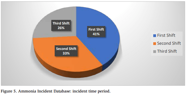 The time of day may have affected the timing of ammonia incidents. For example, more ammonia incidents may have occurred during off-shifts because less experienced personnel may have worked during these shifts.