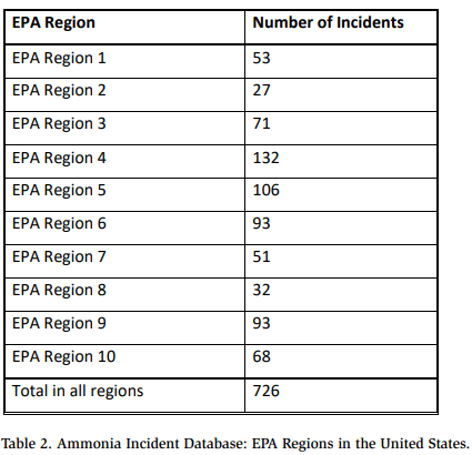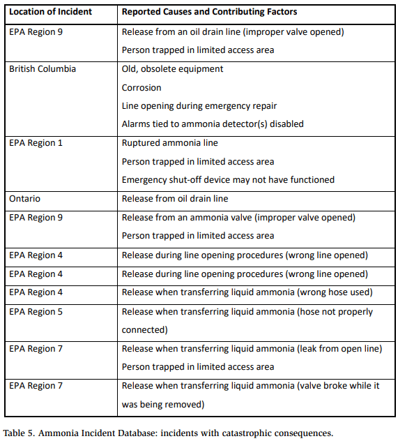 The following additional information was gleaned from the Ammonia Incident Database:
