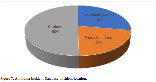 Figure 7 shows the location within the facilities where incidents occurred. More incidents occurred in machinery rooms than in production areas (i.e., indoor areas other than the machinery room), probably because of the relatively large concentration of refrigeration equipment in machinery rooms. Approximately half of the incidents occurred outdoors. The majority of the outdoor incidents (~73%) in the Ammonia Incident Database were releases from pressure relief valves, and most of the releases from pressure relief valves resulted in injuries and/or off-site consequences.
