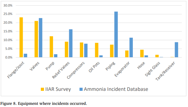 Figure 8 summarizes the equipment where releases occurred as reported in the IIAR survey and the Ammonia Incident Database, which indicate that 60 to 65% of the releases occurred from flanges, joints, valves, and piping. This was consistent with EPA’s RMP database, which reports that approximately half of the releases originated from valves and piping.