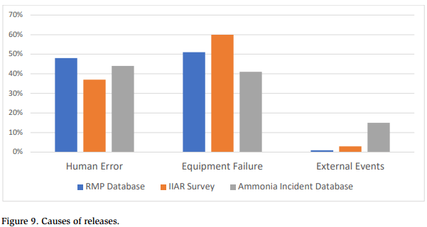 Figure 9 shows the breakdown of incidents caused by human error, equipment failure, and external events in EPA’s RMP database, the IIAR survey, and the Ammonia Incident Database. Each database indicates that a similar number of incidents (between 37 and 48%) were due to human r. The biggest discrepancies were in the number of incidents caused by equipment failure (41% in the Ammonia Incident Database vs. 60% in the IIAR survey) and the number of incidents related to external events (15% in the Ammonia Incident Database vs. 1% in the RMP database and 3% in the IIAR survey). Causes of external events included fires, impacts from motorized equipment (such as forklifts), weather-related events, and damage due to structural or building failure.