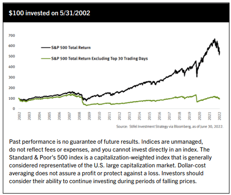 During a bear market, investors may be reluctant to sell and too eager to buy. Other investors waiting for the right to time to act may simply stay on the sidelines while missing out on valuable opportunities. No matter how you look at it, timing the market is not an effective strategy for most long-term investors. During market volatility, you may feel nervous about your finances. This nervousness can lead to knee-jerk reactions. You may even be tempted to try and time the market to minimize your losses or manufacture gains. History tells us succumbing to this temptation would be a mistake. According to Stifel’s Investment Strategy team, a $100 investment in the S&P 500 on May 31, 2002, would have been worth about $510 on June 30, 2022. However, if you missed the S&P 500’s 30 best trading days during this timeframe, your return would be close to 0%.
