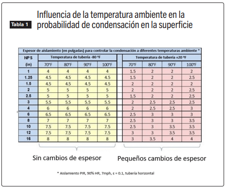 La primera condición climática que se examina por su influencia en la condensación superficial del aislamiento es la temperatura ambiente. La Tabla 1 muestra cómo se debe ajustar el espesor del aislamiento para prevenir la condensación superficial a medida que cambia la temperatura ambiente. Esto se muestra tanto para una tubería muy fría a -62ºC (-80°F) como para una tubería a -6,6ºC (20°F). El material de aislamiento utilizado para esta tabla es poliisocianurato (PIR), especificado según ASTM C591, Grado 2, Tipo IV. Las condiciones constantes específicas utilizadas para esta tabla fueron 90% de humedad relativa, viento de 3 m/s (7 mph), revestimiento de aluminio con una emisividad (ε) de 0,1 y tubería horizontal. El tamaño de la tubería, la temperatura ambiente y la temperatura de la tubería se variaron como se muestra.