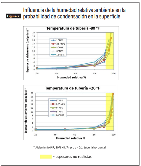 La influencia de la humedad relativa del ambiente en la condensación superficial se muestra en la Figura 2, que representa gráficamente el espesor del aislamiento necesario para prevenir la condensación superficial a medida que se cambia la humedad relativa ambiente. Esto se muestra tanto para una tubería muy fría a -62ºC (-80°F) como para una tubería a -6,6ºC (20°F). El material de aislamiento utilizado en estos gráficos es nuevamente poliisocianurato (PIR). Las condiciones constantes específicas utilizadas para estos gráficos fueron una temperatura ambiente de 32ºC (90°F), viento de 3 m/s (7 mph), revestimiento de aluminio con una emisividad (ε) de 0.1 y tubería horizontal. El tamaño de la tubería, la humedad relativa ambiente y la temperatura de la tubería se variaron como se muestra.