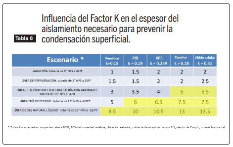 La Tabla 6 muestra la fuerte influencia de la conductividad térmica del aislamiento en el espesor necesario para prevenir la condensación en la superficie. A medida que la conductividad térmica disminuye (mejora), el espesor de aislamiento requerido también disminuye.