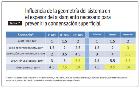 La Tabla 7 muestra la influencia del tamaño de la tubería y la orientación de la superficie plana en el espesor de aislamiento necesario para prevenir la condensación. Como se puede observar, a medida que aumenta el tamaño de la tubería (NPS), también aumenta el espesor de aislamiento requerido, y este efecto es moderado y crece en importancia a temperaturas de tubería más frías. Además, se puede ver que el espesor de aislamiento requerido en las superficies planas frías es mayor en la parte superior de un tanque o conducto, menor en la parte inferior e intermedio en los costados del tanque o conducto.