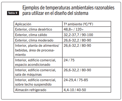 Se recuerda que se mencionó anteriormente en este documento que el impacto de la temperatura ambiente en la probabilidad de control de condensación o en el espesor del aislamiento necesario para prevenir la condensación es pequeño. Como resultado, la selección precisa de una temperatura ambiente no es muy importante. El enfoque más común y perfectamente aceptable es seleccionar una temperatura razonablemente extrema para la situación. La Tabla 9 muestra algunos ejemplos de temperaturas ambientales razonables para utilizar en el diseño de sistemas de aislamiento para diversas aplicaciones.