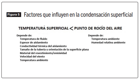 La condensación superficial en los sistemas de aislamiento para equipos mecánicos fríos (tuberías, tanques, recipientes, etc.) es un concepto sencillo. La condensación superficial ocurre cuando la temperatura de la superficie del sistema de aislamiento es inferior a la temperatura de punto de rocío del aire circundante. Esta relación sencilla se vuelve complicada debido a que cada una de estas dos temperaturas depende de la interrelación de una multitud de factores, como se muestra en la Figura 5.