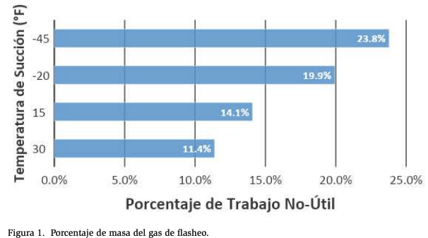 El gas de flasheo no es una carga insignificante. Refiriéndonos a la Figura 1, la masa del gas de flasheo, dependiendo de la temperatura, esta entre un 1/8 y un ¼ del total del flujo de masa a los compresores. Este hecho es clave en el porque el Balance de Masa es muy importante. El gas de flasheo es la carga más grande después de la carga térmica misma de refrigeración – y es muy significativa para solo adivinarla. Cuando sistemas de múltiple temperatura son utilizados – balance de masa es la única forma de poder calcular precisamente cuanto gas de flasheo puede ocurrir a cada nivel de temperatura.