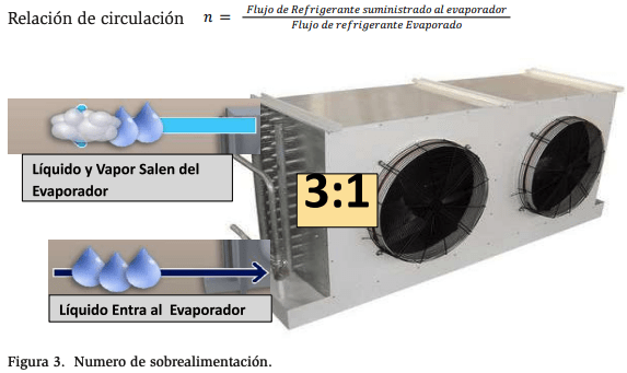 El Manual libro de Refrigeración del ASHRAE, 2018, Pagina 4.4, menciona: “En sistema con liquido sobrealimentado, la relación de masa de liquido bombeado a la cantidad de liquido vaporizado es el número de Circulación o relación de recirculación.” La relación de circulación define la cantidad del refrigerante a la salida del evaporador. Si la Calidad de vapor es 505, entonces es una relación de circulación 2:1. Si la Calidad de Vapor es 33%, la relación de circulación es 3:1. Es una relación simple entre la cantidad de vapor generado y la canide de liquido alimentado al evaporador, es la Inversa de la Calidad de Vapor