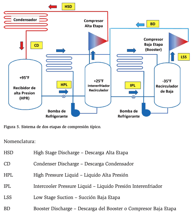 Note que el líquido alimentado al recipiente de -35°F (-37.2°C) proviene del recipiente interenfriador de +25°F (-3.9°C). El líquido del Recipiente de Alta Presión (HPR) es primero enfriado a +25°F (-3.9°C) luego a -35°F (-37.2°C). Note que el sistema se muestra un sistema de Dos Etapas interenfriado. Este método generalizado trabaja para cualquier refrigerante – y es válido para tanto sistema de una o dos etapas de compresión. En un sistema de una Etapa, los valores de BD serán cero. Para un sistema de dos etapas interenfriado, el sistema se vería como este: