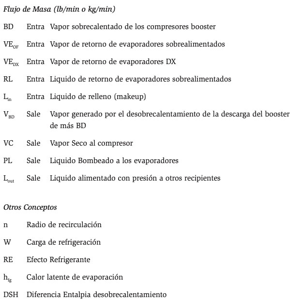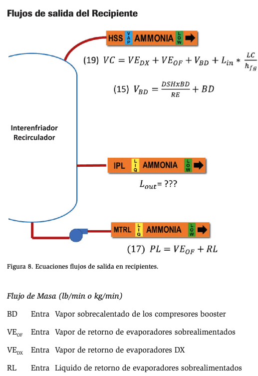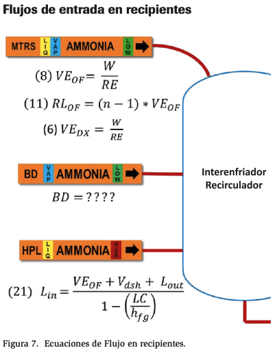 El vapor generado en los evaporadores (VE), y el liquido de relleno al recipiente (Lin) son independientes del rango de recirculación. El único lugar donde el liquido recirculado entra en el cálculo, es para el rango de bombeo (PL) y la cantidad de liquido retornando en el cabezal de Succión Mojada (RL). El vapor al compresor (VC) es simplemente la suma del vapor generado en los evaporadores (VE), el enfriamiento realizado en la descarga de gases (Vdsh) el flujo de masa de la descarga del Booster (BD) mas cualquier carga por Flash Gas.