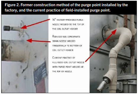 As a result, flow through the purge valve had to be throttled back until the violent behavior subsided. Before long, the frost would melt away and air bubbles were seen in the buckewe wereAfter several of these experiences, I came to realize that the liquid ejection would happen when the refrigeration load decreased. It appeared to me that the liquid was gathering in the condenser coil and “bottling up” in the circuits. In those days it was common practice for a condenser manufacturer to design coil circuits with 4” inlet connections and a 2” outlet connection (Figure 2). The outlet connection was installed flush with the bottom of the drain header to assure full drainage as liquid reached the end of the coil circuits. There was a bent 1/2” schedule 80 nipple to purge from. The nipple was welded to the top of the condenser drain header to direct refrigerant and non-condensables (foul gases) to the purge line for expulsion. This was the case for the condensers I purged in the 1980s. The build-up of scale on the coils caused extended reaction times to changes in conditions; very sluggish responses to load changes masked the causes of the discharge pressure issues.