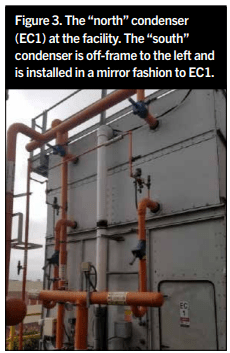 The facility where the cause of the trouble was discovered has two equally sized condensers which receive proper water treatment and care. There is no scale on the surfaces. The two condensers discharge into their own horizontal collection header, downstream of the P-traps of each coil (Figure 3).