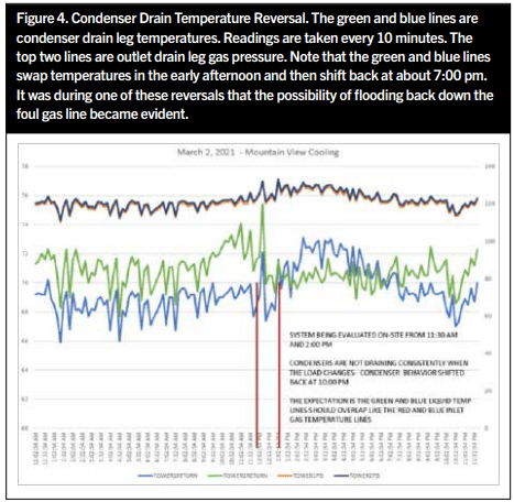 The temperature of the liquid in the “north” condenser collector header approximated the wet bulb temperature that day. The companion (south) condenser’s drain temperature was as expected and in agreement with saturation. So, one condenser was discharging subcooled liquid while the other was delivering saturated liquid to the thermosiphon pilot-receiver. If everything is being controlled in the same manner, the same outcome should be expected from the condensers. However, when the fourth compressor (500 hp ~ 30% of the capacity of the system) came online and loaded up, the condenser that previously was running “properly” began to discharge subcooled liquid. At the same time, the companion condenser that was running improperly began to properly discharge saturated liquid.