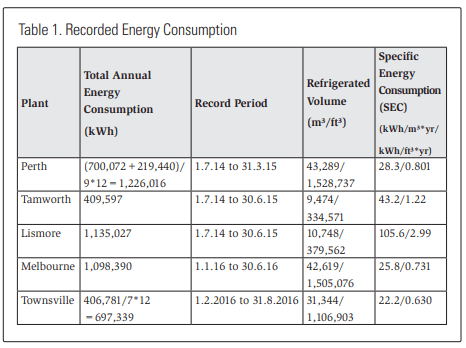 Some evidence in Table 1 shows that the energy consumption of auxiliary services such as office air conditioning, IT, general light and power, etc. is sufficiently significant to warrant separate recording. The Townsville facility is located in a subtropical area, has 26% less refrigerated volume than the Melbourne facility, yet features 14% lower SEC. Both facilities are fitted with desiccant driers. Based on the difference in refrigerated volume between Melbourne and Townsville, the SEC for Townsville should have been 27.7 kWh/m³*yr (0.78 kWh/ft³*yr) using the SEC for Melbourne as the base for extrapolation and possibly even a little higher due to the approximately 3°K (5.4°F) higher wet bulb temperature in Townsville. The difference between 22.2 and 27.7 kWh/ m³*yr (~20%) may therefore be taken as being representative of the energy consumption of the auxiliary services.